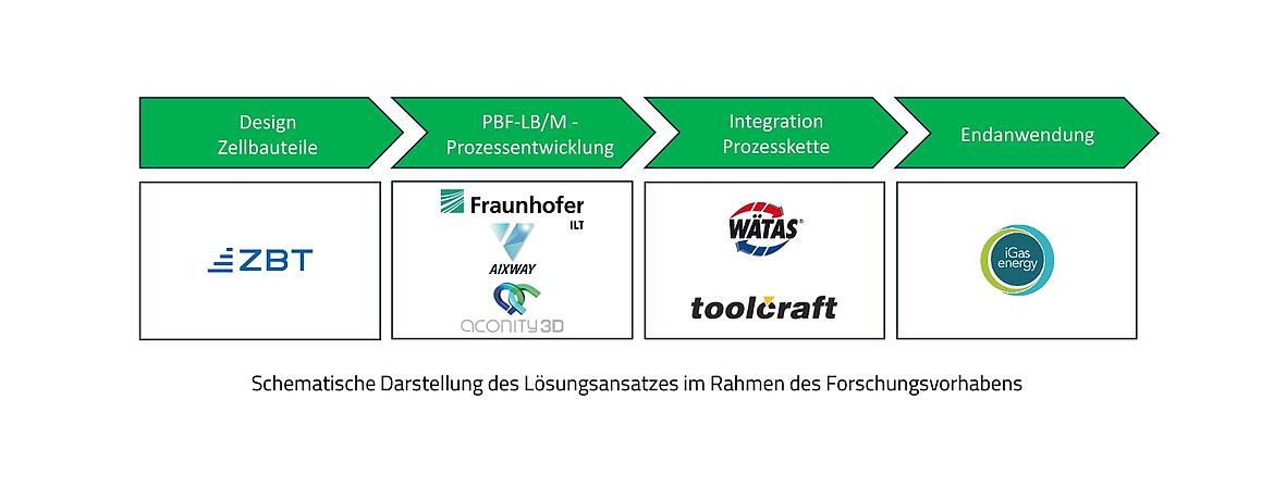 Im geplanten Vorhaben wird ein ganzheitlicher Ansatz verfolgt, um basierend auf dem grundlegenden Funktionsnachweis der neu entwickelten Zellkomponenten den Test eines vollständigen Elektrolysesystems in einer relevanten Umgebung zu ermöglichen. Hierfür werden in AP1 (=Arbeitspaket 1) die Anforderungen an die Bauteile und die Fertigungsprozesse in einem Lastenheft definiert. Anschließend beginnt der iterative Entwicklungszyklus: Angelehnt daran wird in AP3 und AP4 der Fertigungsprozess sowie die notwendigen Nachbehandlungsprozesse entwickelt und an den entworfenen Komponenten erprobt. In AP5 werden die gefertigten Komponenten erprobt und analysiert, was als Input für eine weitere Iterationsschleife dient. Am Ende dieses Prozesses steht das optimierte Design des AM gefertigten Systems sowie die dafür notwendigen Prozesse. In AP6 findet abschließend die Fertigung und Charakterisierung eines Demonstrators im industrierelevanten Maßstab statt.